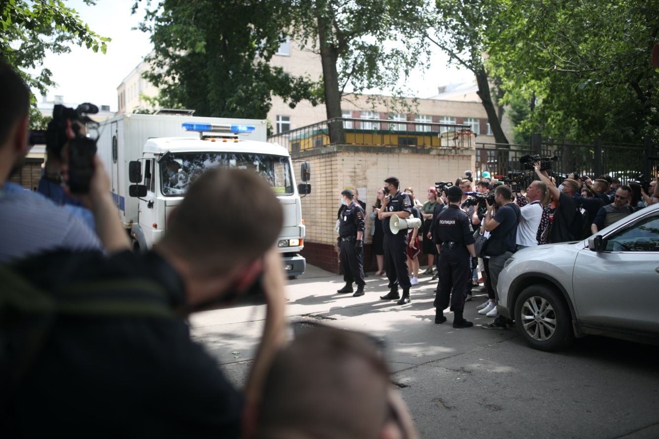 Around 15:30, reports emerge that Safronov has been formally charged with treason. Safronov’s sister Irina covers her face with her hands. A paddy wagon full of detainees leaves for the Kuzminki Police Station. The sidewalk outside of the Lefortovo Pretrial Detention Center begins to clear. On the other side of the street, lawyer Ivan Pavlov repeatedly tells reporters that the prosecution didn’t provide any evidence of Safronov’s guilt, and that he’s being persecuted for his journalistic activities.