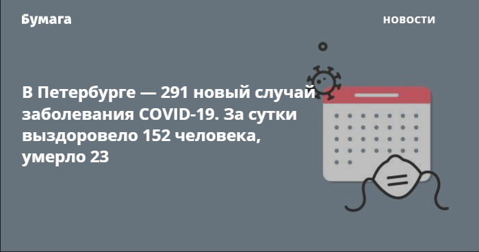 В Петербурге за сутки зафиксировали 291 новый случай заражения коронавирусом, 152 новых выздоровления и 23 смерти. Об этом сообщает оперштаб.