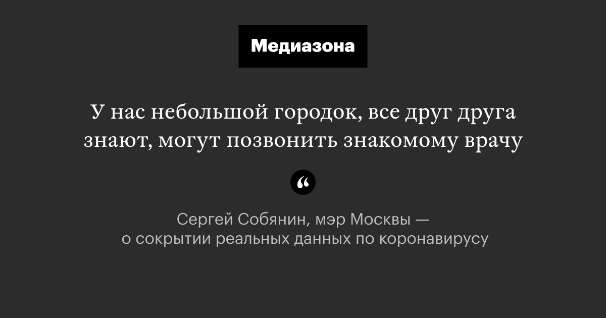 «А вы верите, что в Москве можно что-то скрыть? У нас небольшой городок-то, все живем в радиусе 15 километров. Все друг друга знают, могут позвонить знакомому врачу, спросить у друзей, кто болеет», — сказал Собянин в интервью «Комсомольской правде».
