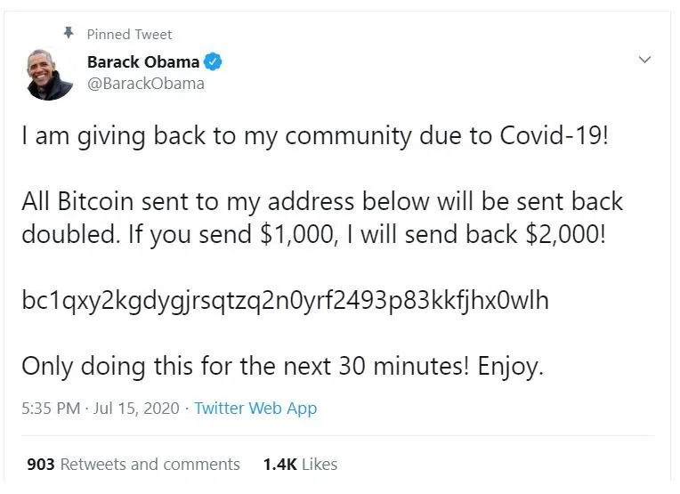 Все твиты были однотипные: «Я хочу вернуть свой долг перед обществом. Все биткоины, что придут на мой адрес, я удвою: если вы отправите тысячу долларов, я верну две, — говорилось в сообщении Барака Обамы. — Делаю это только ближайшие 30 минут. Удачи всем». Как минимум 367 пользователей перевели около 120 тысяч долларов США на указанный в постах кошелек, уточнили «Новой» в «Лаборатории Касперского».