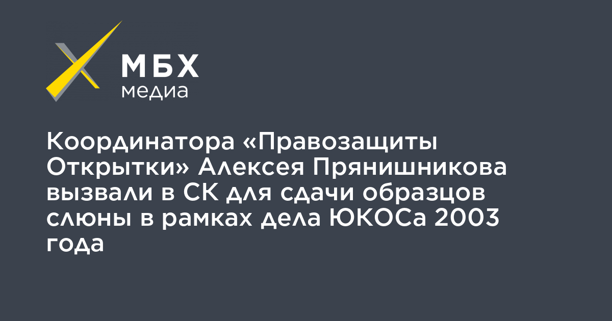 Координатора «Правозащиты Открытки» Алексея Прянишникова вызвали в следственный комитет для сдачи отпечатков пальцев и образцов слюны для проведения генотипической экспертизы в рамках расследования дела ЮКОСа 2003 года. Об этом «МБХ медиа» сообщил сам Прянишников.