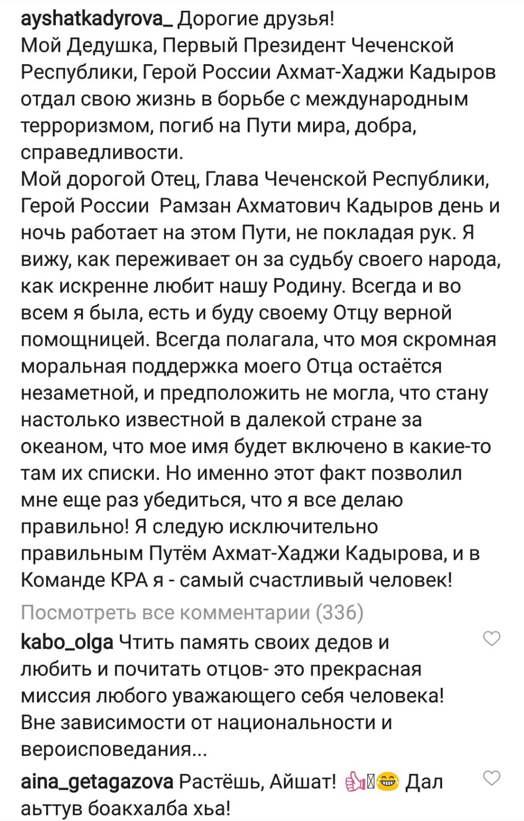 "Всегда полагала, что моя скромная моральная поддержка отца остается незаметной, и предположить не могла, что стану настолько известной в далекой стране за океаном, что мое имя будет включено в какие-то там их списки", - написала дочь Кадырова.