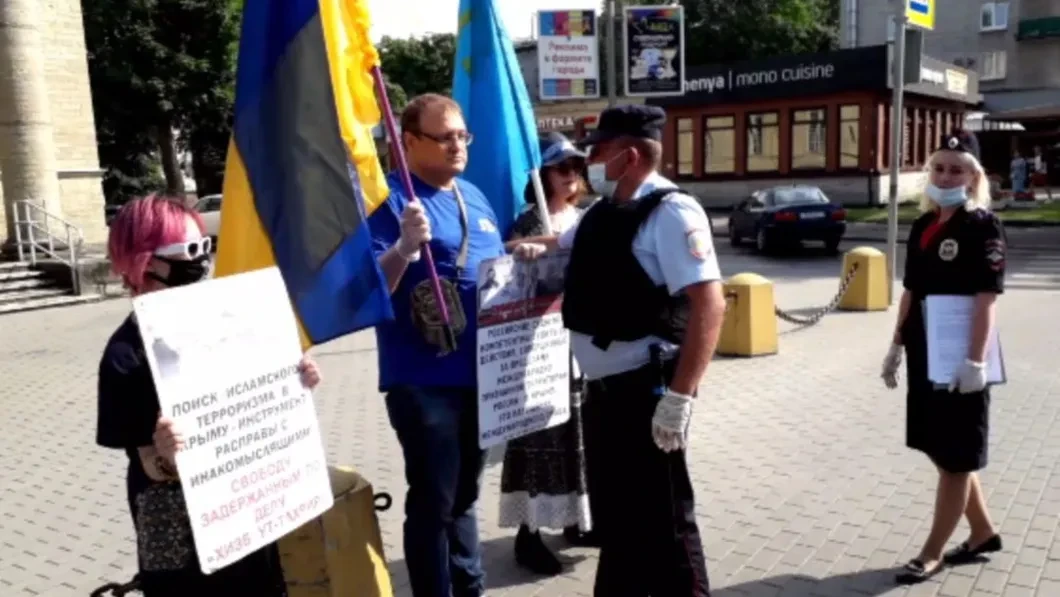 Теперь активисту, стоявшему с пикетом против уголовного преследования крымских татар, может грозить тюремный срок за «удар древком от флага» по голове полицейского во время падения.