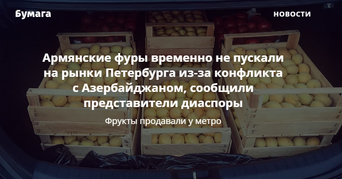 Представители армянской диаспоры в соцсетях рассказывают, что привезенные в Петербург фрукты продавали у станции метро «Звездная» и на территории у торговых центров «Рио» и «Монпансье». Они также уточняют, что сейчас «фуры пускают [на оптовые базы], но никто не дает гарантию безопасности».