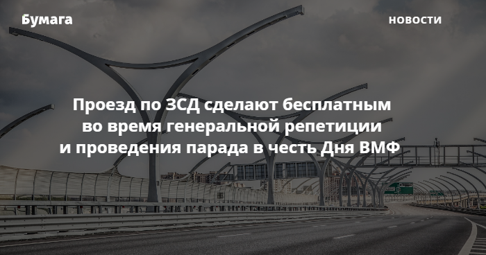 Во время генеральной репетиции и проведения парада ко Дню ВМФ в Петербурге проезд по ЗСД сделают бесплатным. Об этом сообщается на сайте Смольного.