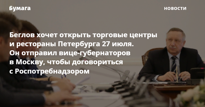 Как пишет «Фонтанка», на совещании правительства Беглов поручил Елину и Эргашеву немедленно выехать в Москву и на месте договориться с Роспотребнадзором об открытии торговых центров и ресторанов — и вернуться в четверг или пятницу с решением ведомства. «Если решение опять будет отрицательное, я сам поеду тогда в субботу в Роспотребнадзор», — добавил губернатор.