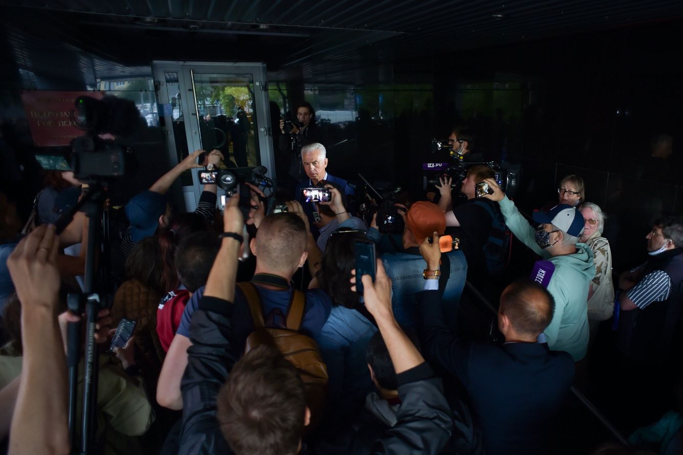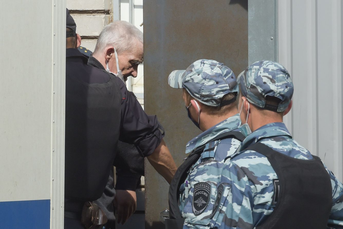 В это время во внутренний двор суда из СИЗО привозят самого Дмитриева. Увидеть его удается немногим — полицейские машины загораживают вход в здание.