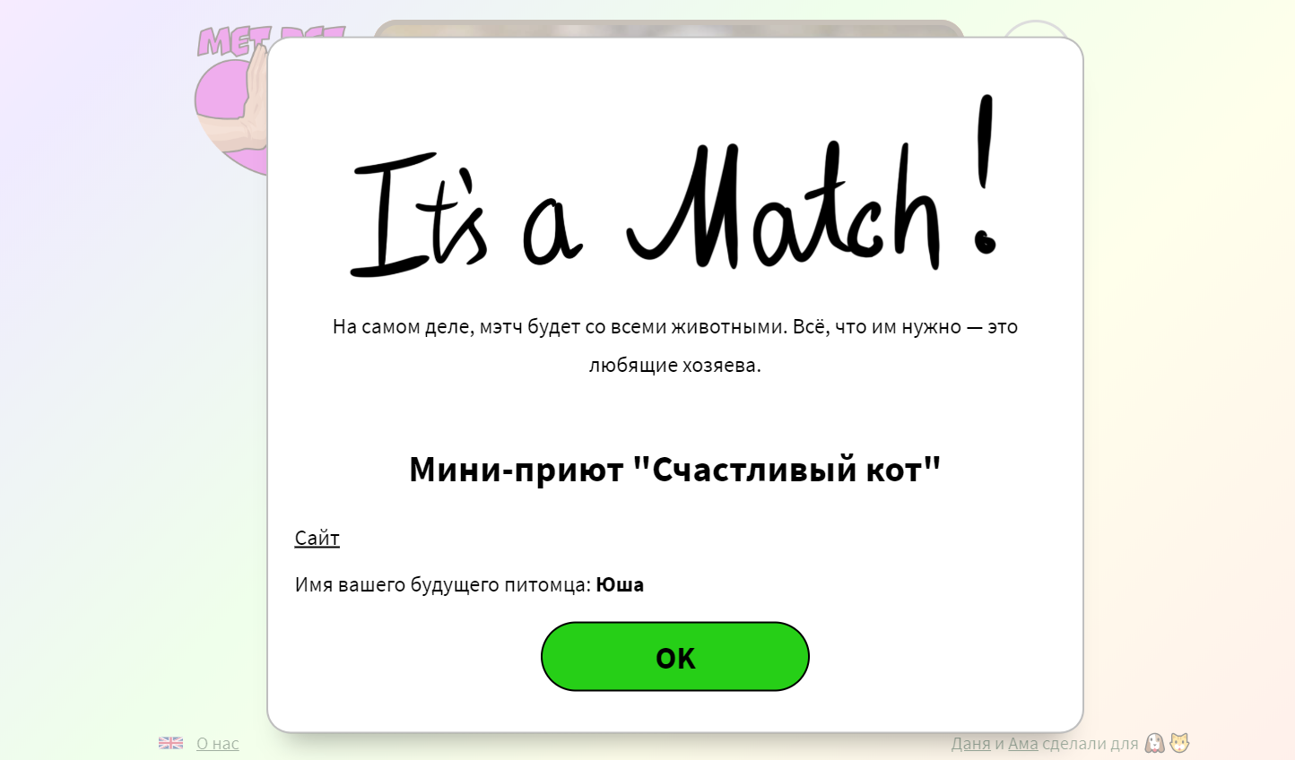 В анкете указаны кличка и возраст животного, наличие прививок, а также некоторые черты характера. На сайте есть кнопка, которая показывает все поставленные человеком лайки — таким образом пользователь может выбрать конкретного питомца из нескольких понравившихся.