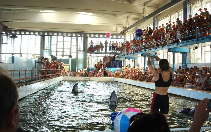 Дельфинов Дельфу и Зевса отловили в Черном море уже взрослыми , рассказала «Проекту» зоозащитница Лусинэ Балабаджян. Сначала — вместе с белухой Платоном — они работали во временном дельфинарии «Морской театр» в Измайловском парке Москвы. Сам театр — несколько рядов трибун и пластиковая чаша диаметром 15 и глубиной 3 метра. По российским и международным меркам это непозволительно маленькая площадь даже для одного дельфина — объем бассейна в парке был 530 кубометров, тогда как по европейским нормам только на одного дельфина должно приходиться 300 кубометров воды, по российским — 200 кубометров. В 2015 году после жалоб москвичей «Морской театр» закрыли.