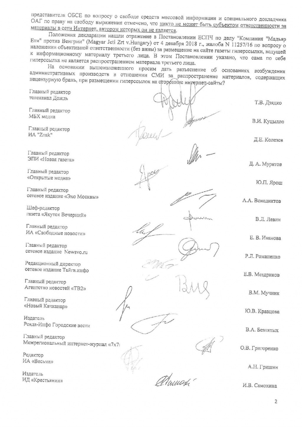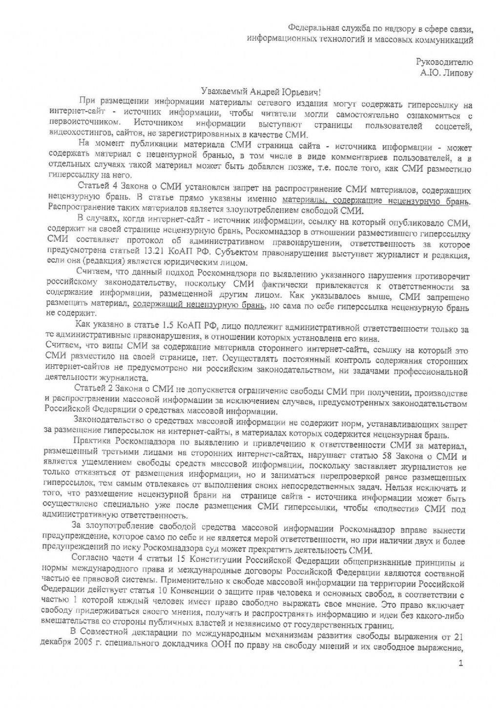«Считаем, что данный подход Роскомнадзора <…> противоречит российскому законодательству, поскольку СМИ фактически привлекается к ответственности за содержание информации, размещенной другим лицом. СМИ запрещено размещать материал, содержащий нецензурную брань, но сама по себе гиперссылка нецензурную брань не содержит», — указывается в тексте.
