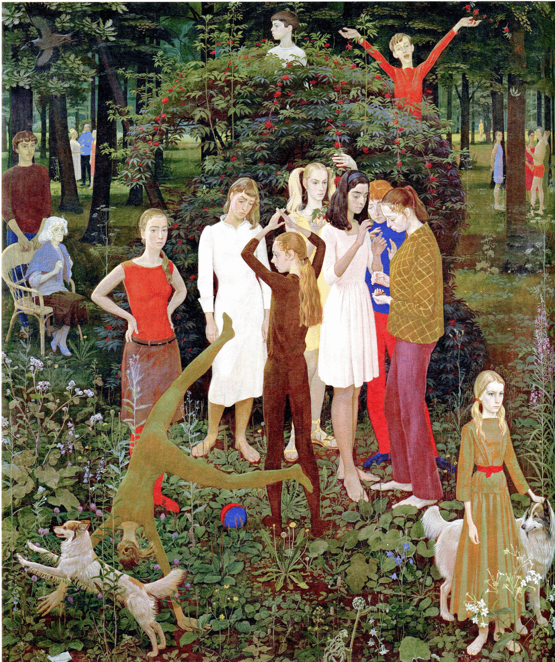 В качестве кода времени она использует хорошо известное понятие «двойная жизнь». В ее разделах «собраны варианты эскапизма, способы обмануть время, чтобы выйти за пределы советской реальности» [3]. Эти варианты эскапизма уже были прописаны советскими искусствоведами — деревня, воспоминания о детстве, сообщество, мастерская и творчество, воображаемая история. Но самое досадное то, что перед зрителем вновь разыгрывается бинарная схема, в которой художники пытаются бежать от всесильной и вездесущей Коммунистической партии. Эта схема сильно упрощает и политику власти, и пути искусства. Сегодня хотелось бы задаться вопросом: насколько корректно слово «эскапизм» по отношению к авторам, которые работали с темами деревни и детства или интерпретировали искусство старых мастеров? Не был ли связан этот поворот с изменением официального дискурса, в котором появилась идея «всесторонне развитой личности», а выражение «духовный мир» стало возникать рядом со словосочетанием «развитой социализм»? Что представляют собой, например, работы Елены Романовой или Татьяны Федоровой — пример эскапизма или «поздние модификации соцреализма», о которых лишь однажды, вскользь и без конкретных примеров сказано в тексте к выставке? Апроприация культурного наследия, культ молодости и бесконфликтность — все эти идеи официального дискурса, безусловно, повлияли на многих художников.