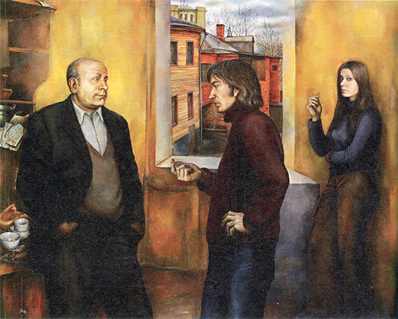 © Саратовский государственный художественный музей имени А.Н. Радищева Татьяна Назаренко. Мои современники. 1974 Но если допустить, что деление истории советского искусства на абстрактные «шестидесятые» и «семидесятые» все же возможно, то какую дату можно было бы считать поворотной? Разные художественные сообщества имели свою историю и свои ключевые точки, которые не совпадали с ключевыми точками истории политической. Для МОСХа это был 1963 год, когда после скандала в Манеже были изменены состав правления и порядок выборов, расформирована секция критиков. Для художников, трудившихся в комбинате (как членов, так и не членов МОСХа), такой датой мог бы стать 1965 год — год введения гарантированного аванса, системы, сделавшей труд художников более защищенным и подарившей им месяцы свободного времени. Для неофициального искусства это могли бы быть 1974 год — выставка на пустыре в Беляеве и последовавшие за ней выставки в Измайлове и на ВДНХ, или появление соц-арта в начале 1970-х, или статья Бориса Гройса «Романтический концептуализм» в 1979-м.