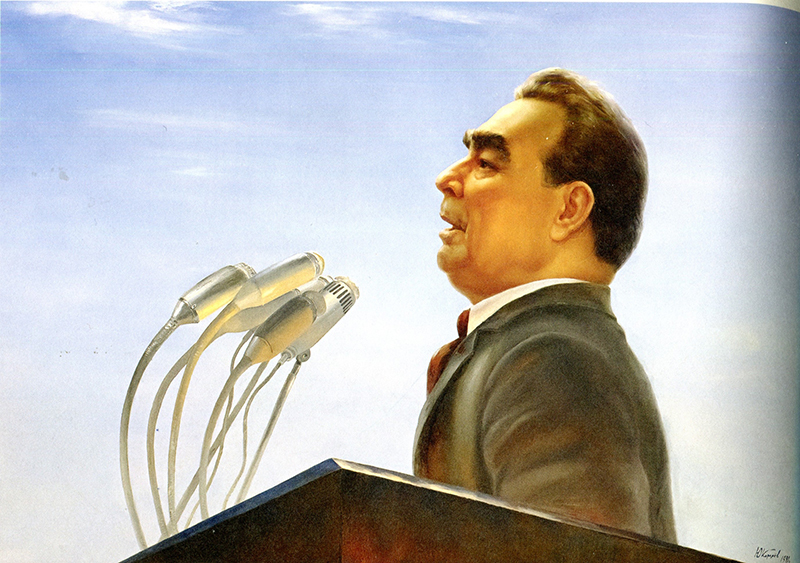 © Государственная Третьяковская галерея Виктор Пивоваров. Композиция с красным квадратом. 1974 Общепринятая, хотя и весьма условная, периодизация («оттепель» — «застой» — «перестройка») позволяет пренебречь спецификой различных художественных процессов и объединить в один рассказ необъединяемые сюжеты. Идеологический фон и воссозданные в оформлении выставки элементы советского быта (телевизор, обои, шкафы) — это то немногое, что было общего у художников, работавших в 1968-м и в 1985-м, у приверженцев академической живописи и у концептуалистов. Телевизор передает новогоднее поздравление Брежнева, и посетитель выставки узнает, что 1969 год был отмечен рекордными сборами зерна, что отчаянно велась борьба с империализмом, строились новые магистрали и города, а в следующем году весь советский народ будет отмечать столетие Ленина.
