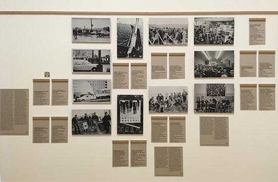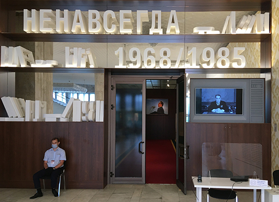 Первый зал рассказывает об идеологическом контексте, в котором работали художники, о «гнетущей атмосфере застоя». Парадоксально, но выставка обходит самую главную составляющую этой атмосферы — грубое несоответствие партийных лозунгов действиям. Исторический контекст 1968–1985 годов — это войны во Вьетнаме и в Афганистане, аресты правозащитников, карательная психиатрия, цензура во всех областях творчества. Вместо разговора об этом контексте мы видим кадры из фильма «Семнадцать мгновений весны», антивоенную графику Сергея Якутовича, картины «Карнавал» Николая Ерышева и «Стол переговоров» Сергея Овсепяна, которые указывают на присущее времени переживание близости войны. Другими словами, вместо исторического контекста зрителю явлены идеологические заслонки, которые в отрыве от реальности не кажутся ни страшными, ни подавляющими. Скорее, они выглядят карикатурами на самих себя и, несмотря на обстоятельные экспликации, сливаются в экспозиции с работами художников соц-арта.
