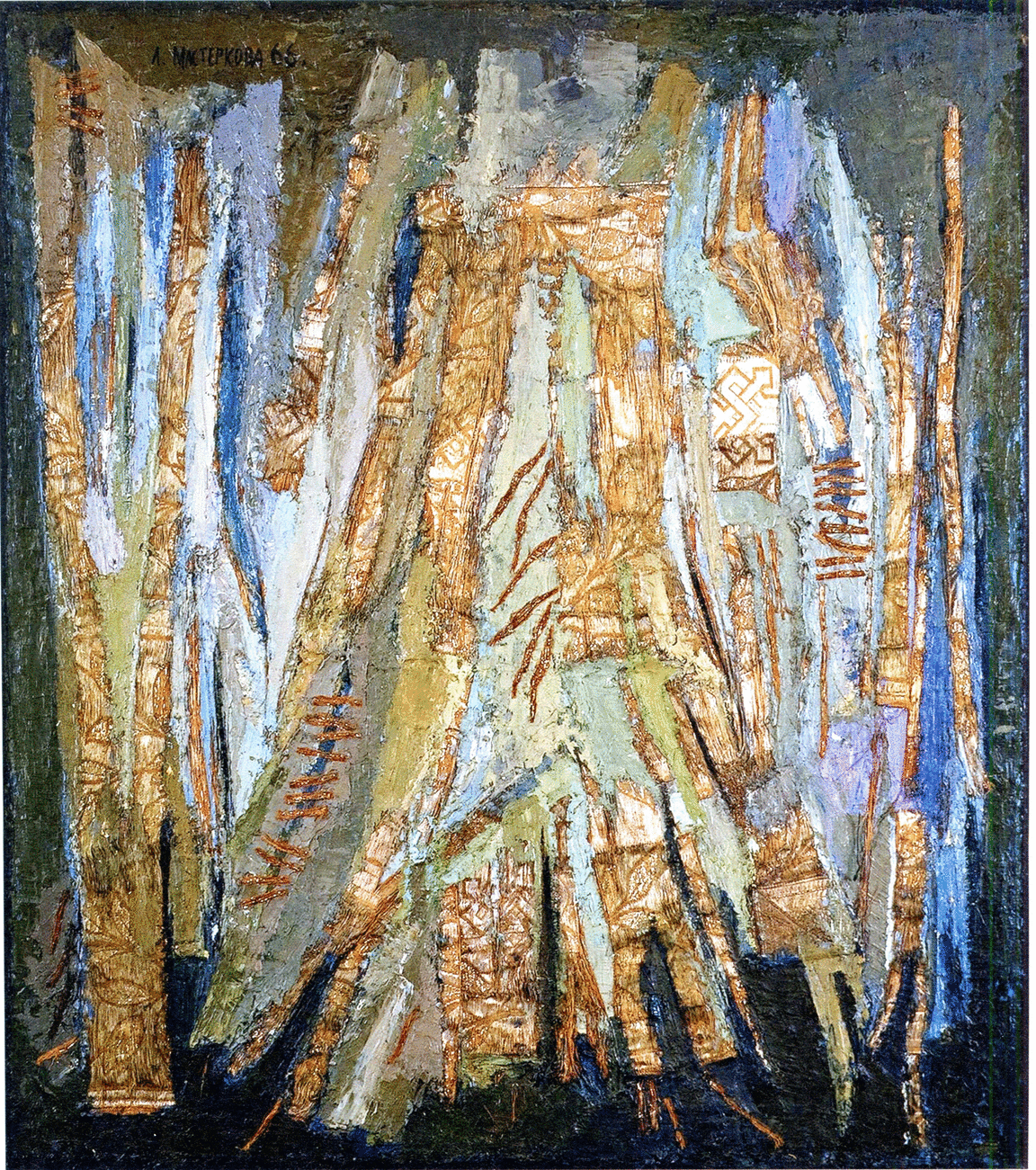 Концепция деления искусства на официальное и неофициальное обсуждается уже много лет. Выставка «Ненавсегда» утверждает: «Официальное и неофициальное отражались друг в друге по принципу действия кривых зеркал» [4]. В некоторых случаях, когда речь идет о станковой живописи, такое соседство выглядит удачно. Например, в разделе «Религиозный мистицизм» иературы Шварцмана перекликаются с «Собором» Лидии Мастерковой и картиной Виктора Попкова, изображающей экскурсию в храме.