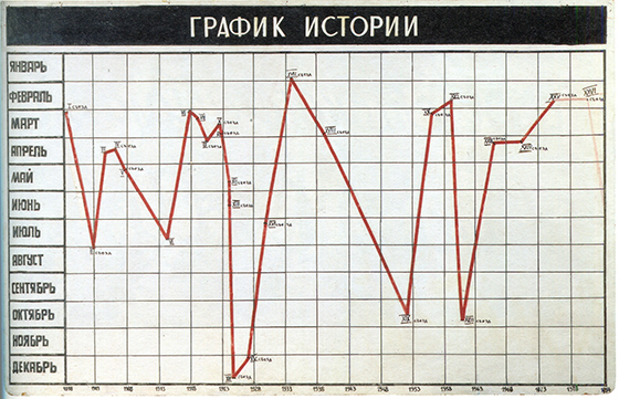 © Государственная Третьяковская галерея Группа «Гнездо». График истории. 1976 Последние несколько лет довольно часто говорят о том, что пришло время пересмотреть сложившуюся ситуацию, найти новые подходы к этому созданному уже почти полвека назад и все же по-прежнему очень близкому нам материалу. Такие амбициозные задачи поставили перед собой Кирилл Светляков, Юлия Воротынцева и Анастасия Курляндцева — кураторы выставки «Ненавсегда», которая проходит сейчас в Новой Третьяковке. Название «Ненавсегда» содержит одновременно и грусть о невозвратно ушедшем, и весьма обнадеживающее утверждение: советский период закончился, и мы готовы посмотреть на его искусство беспристрастно, отстраненно и трезво, а все, написанное в жанре «моя современность», отныне будет служить историческим источником, а не образцом методологии.
