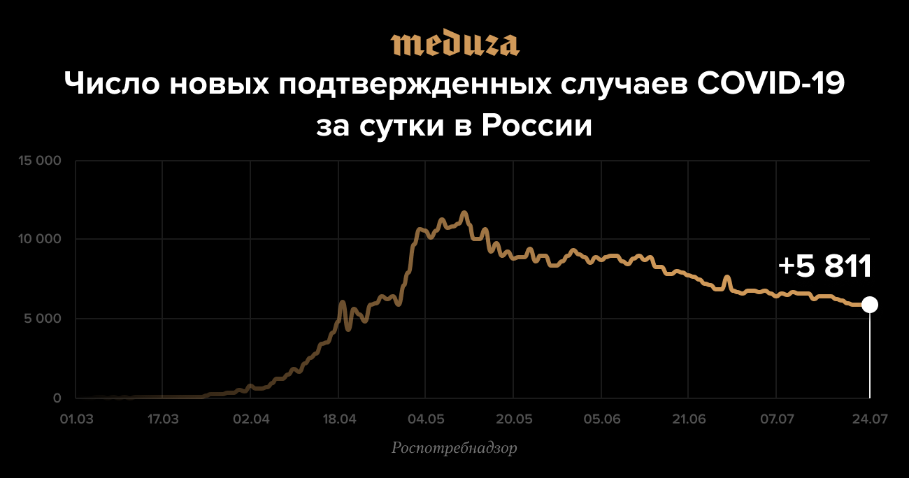 По состоянию на утро 24 июля общее число заразившихся коронавирусом в России с момента начала пандемии превысило 800 тысяч человек. За прошедшие сутки, сообщил федеральный оперативный штаб по борьбе с COVID-19, выявлено 5811 новых случаев коронавирусной инфекции, всего заболели 800 849 человек.