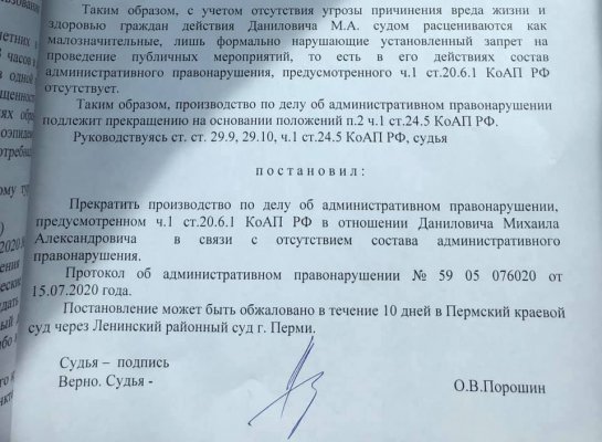 «Суд вынес решение в нашу пользу — прекратить производство по делу в связи с отсутствием состава административного правонарушения», — комментирует руководительница юридической практики «Общественного вердикта» по основным свободам Елена Першакова, которая защищала Даниловича.
