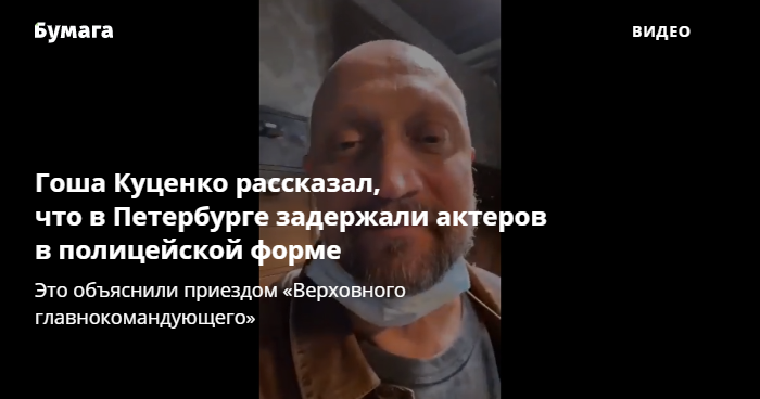 Днем 24 июля Гоша Куценко рассказал, что на Английской набережной в Петербурге люди в штатском задержали актеров массовки, которые были одеты в полицейскую форму. Это объяснили приездом в город «Верховного главнокомандующего». Видео опубликовано в инстаграме актера.