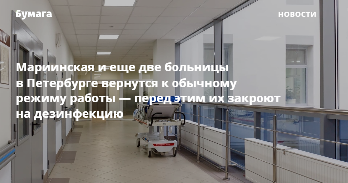 С 27 июля три петербургские больницы, перепрофилированные под оказание помощи людям с COVID-19, вернутся к обычному режиму работы. Перед этим их продезинфицируют, пациентов вывезут из учреждений. Информацию подтвердили «Бумаге» в комитете по здравоохранению Петербурга.
