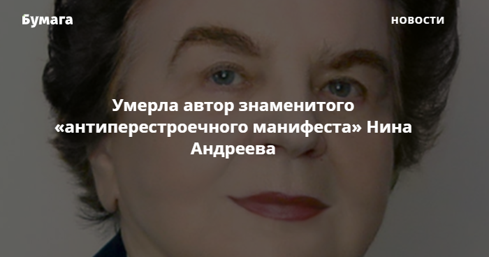 Нина Андреева стала известна после статьи «Не могу поступаться принципами» 1988 года, которую называли «манифестом антиперестроечных сил». В ней женщина критиковала перестройку и политику Михаила Горбачева.