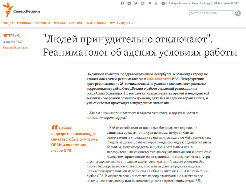 Редакция Русской службы радио "Свобода" уверена в достоверности и надежности распространенной информации. Как заявил президент медиакорпорации РСЕ/РС Джейми Флай, опубликованное на сайте "Север.Реалии" интервью представляет собой отважное и заслуживающее доверие свидетельство человека, который рассказал о том, как обстоят дела в борьбе с критической ситуацией в сфере охраны здоровья. "Российская аудитория заслуживает того, чтобы познакомиться с этим свидетельством, и наша Русская служба обеспечила своим читателям такую возможность, - считает Флай. - Граждане России во время пандемии имеют право на все больший доступ к новостям и информации о том, что происходит в их стране, они не заслуживают попыток подвергнуть цензуре сообщения о недостаточно успешных действиях властей".