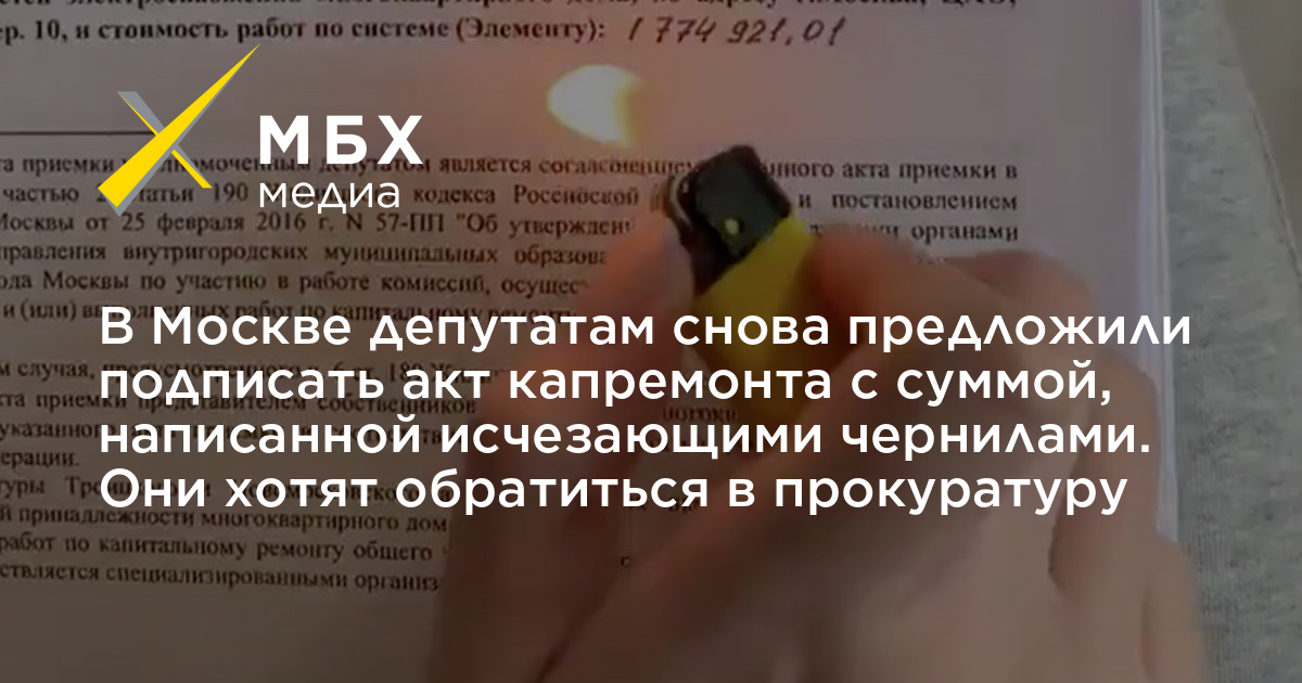 В Москве депутатам снова предложили подписать акт капремонта с суммой, написанной исчезающими чернилами. Они хотят обратиться в прокуратуру