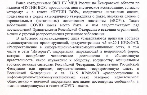 Согласно рапорту, в первой части фразы «Путин — вор COVID — ложь» полицейские усмотрели нарушение по статье об оскорблении власти (ч. 3 ст. 20.1 КоАП), а во второй части — о распространении заведомо ложной информации про (ст. 13.15 КоАП). Из-за ролика с призывом выходить на улицы Кузбасса ему также собираются вменить статью о нарушении правил проведения публичных акций.