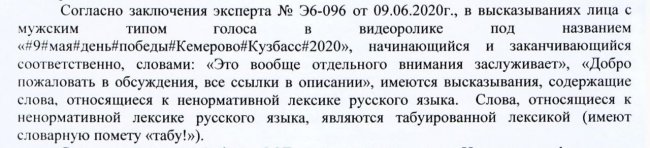 Еще один протокол касается видеозаписи, опубликованной на YouTube-канале «Заповедник Кузбасс», в которой «лицо с мужским типом голоса» произносит слова, «относящиеся к ненормативной лексике русского языка» и являющиеся «табуированной лексикой». В ролике Алферов ходит по Кемерово, общается с разными сотрудниками полиции и показывает, как отмечают 9 мая в городе. Активисту в итоге вменили «оскорбление человеческого достоинства и общественной нравственности».