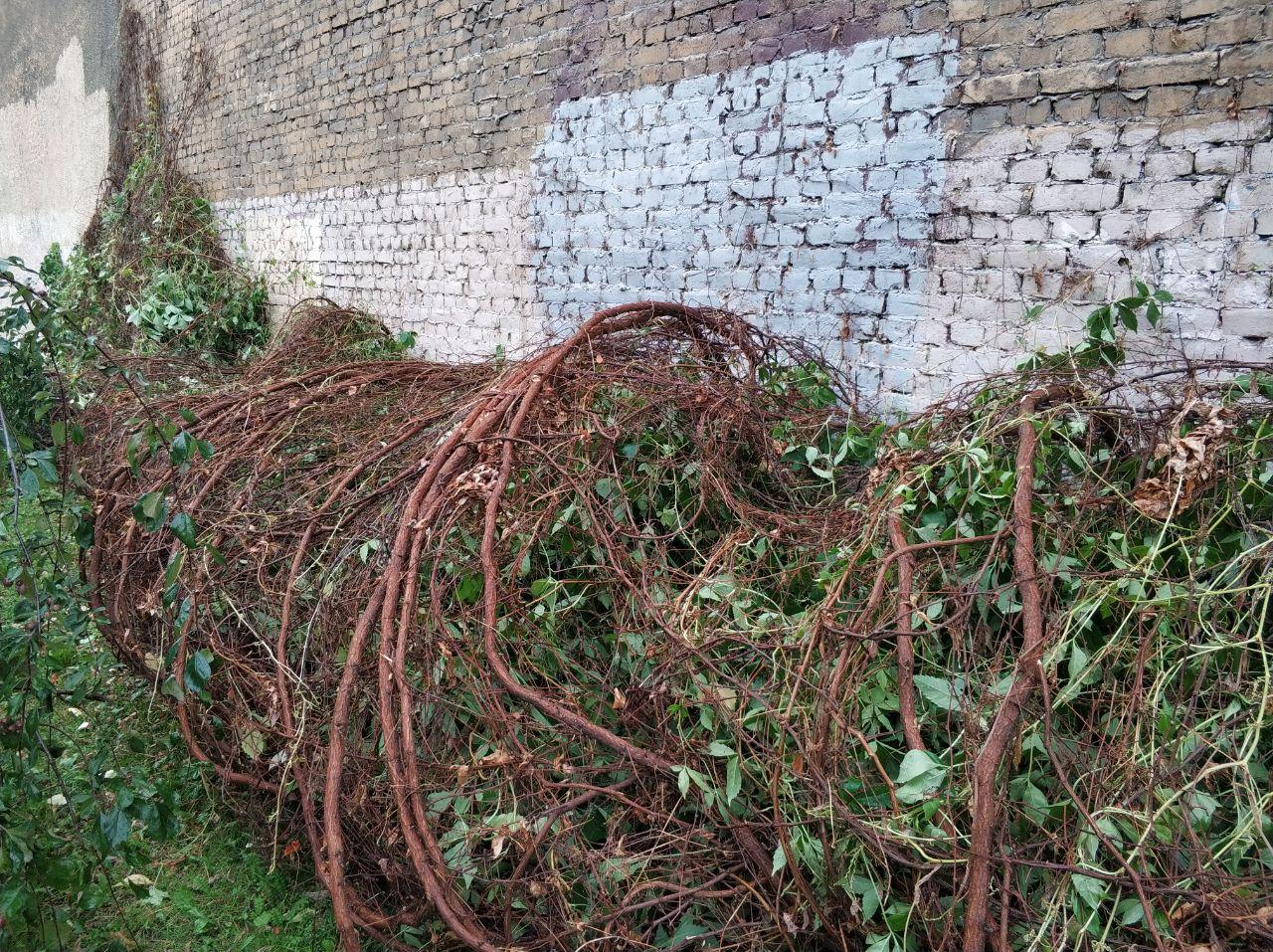 Самое интересное — как поднять девичий виноград, точнее, поднимая, разворачивать. Примерный вес растения, по моим оценкам, — от 500 до 1000 килограмм. Скорее всего нам придется нанимать для этого вышку и привлекать альпинистов: чтобы кто-то поднимал вверху, а кто-то, находясь на вышке, переставлял крепления и жгутами крепил стебли к тросам.
