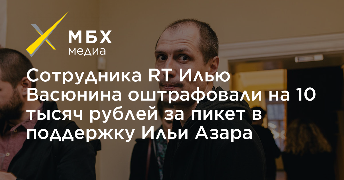 Замоскворецкий суд Москвы оштрафовал на 10 тысяч сотрудника RT Илью Васюнина, задержанного за одиночный пикет в поддержку Ильи Азара в конце мая. Об этом он сообщил у себя в твиттере.