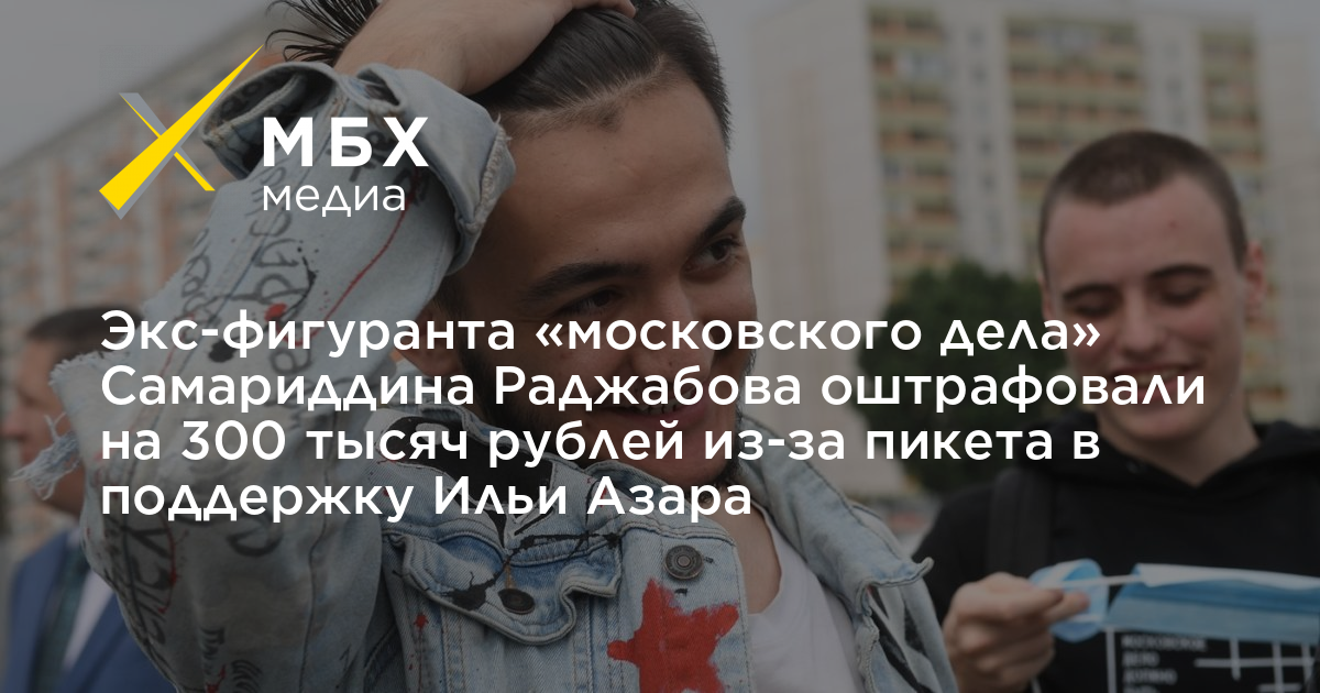 Пресненский районный суд Москвы назначил штрафы по 300 тысяч рублей экс-фигуранту «московского дела» Самариддину Раджабову и активисту Матвею Александрову из-за пикетов в поддержку журналиста Ильи Азара 5 июня. Об этом сообщил «МБХ медиа» адвокат «ОВД-Инфо» Дмитрий Захватов.