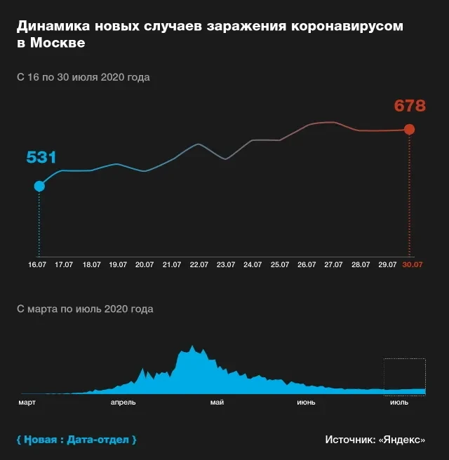 За последние две недели число подтвержденных случаев коронавируса в городе выросло более чем на 30% — с 531 (16 июля) до 694 (27 июля).