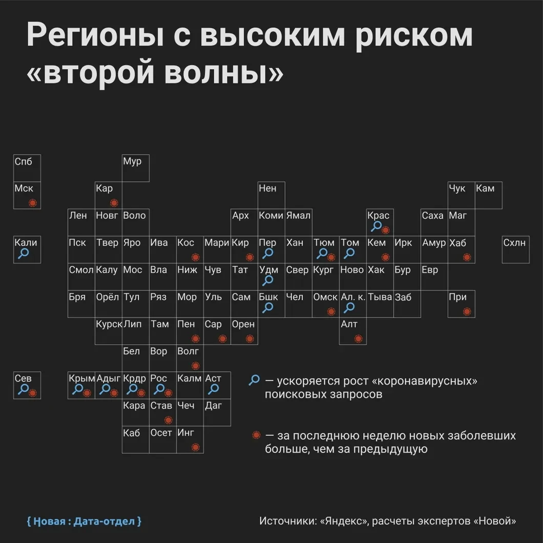 По оценке Бориса Овчинникова, за последнюю неделю такой метод показывает рост заболеваемости как минимум в 12 регионах: частота поиска специфических запросов, касающихся симптоматики коронавируса, в них выросла по сравнению с предыдущей неделей. Еще в пяти регионах — Омской, Свердловской, Челябинской, Оренбургской и Мурманской областях — частота запросов последние три недели тоже росла, однако за последнюю неделю замедлилась: это может означать, что эпидемия там идет на спад.