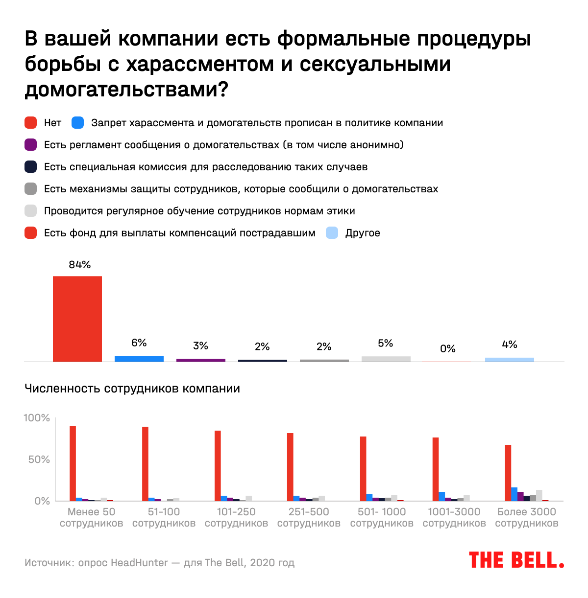 От харассмента и сексуальных домогательств на работе страдают не только сотрудники СМИ. Просто истории из других сфер реже просачиваются в соцсети. Мы решили составить общую картину. По просьбе The Bell сервисы HeadHunter и SuperJob опросили работников компаний разного размера из разных областей. Полученные данные мы обсудили с участниками рейтинга лучших работодателей России, юристами, HR-консультантами и самими жертвами.