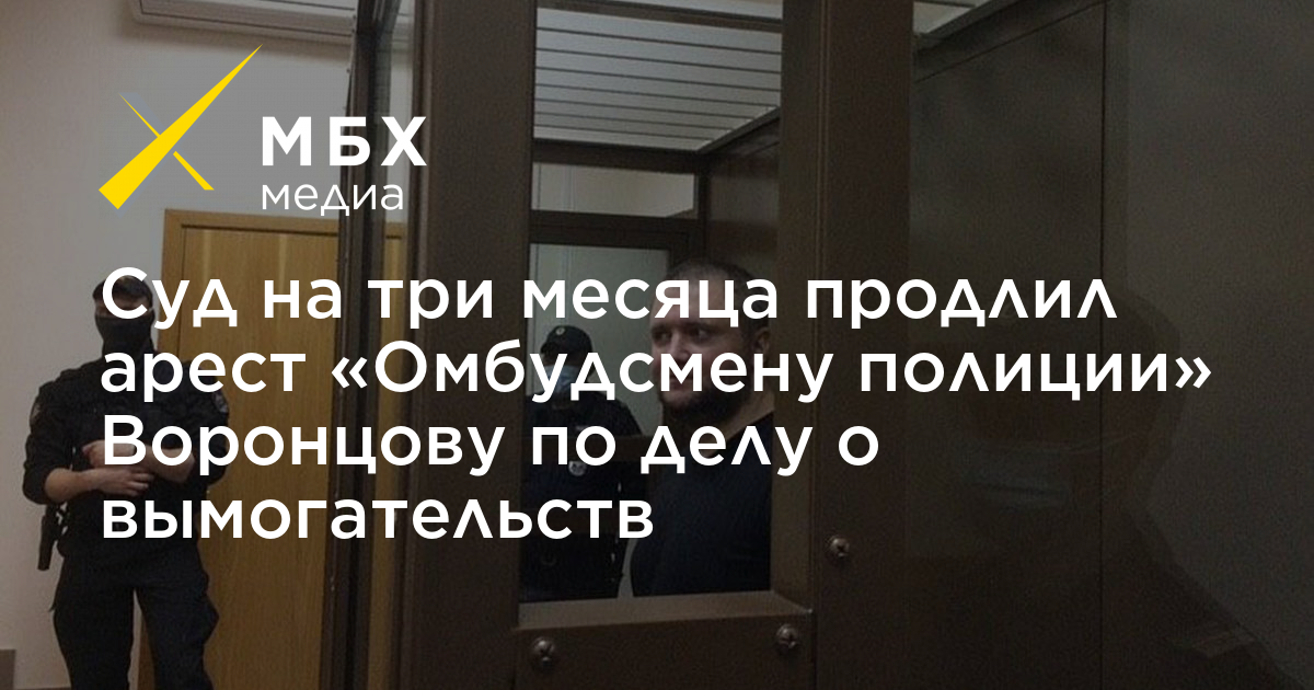 Дорогомиловский районный суд Москвы продлил на три месяца, до 6 ноября, арест автору проекта «Омбудсмен полиции» Владимиру Воронцову по делу о вымогательстве. Об этом сообщает корреспондент «МБХ медиа» из зала суда.