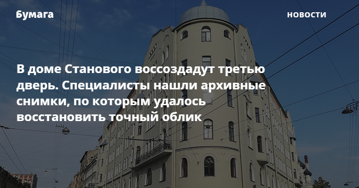 Фонд «Внимание» разработал проект воссоздания двери дома Станового на Мытнинской улице. Специалисты случайно обнаружили архивные снимки, по которым удалось более детально восстановить облик двери. Об этом сообщает пресс-служба фонда.