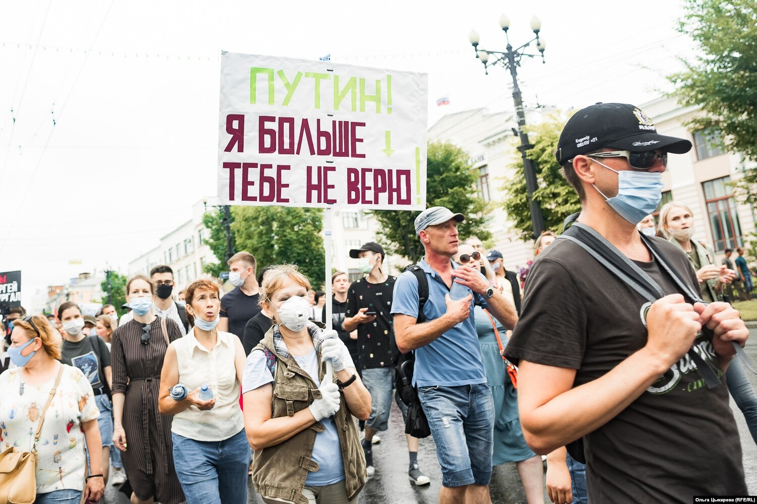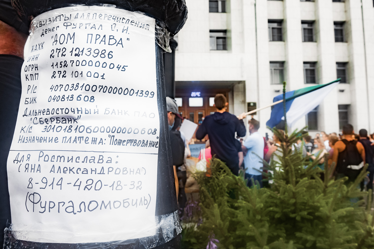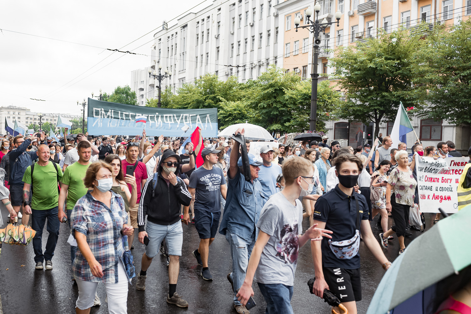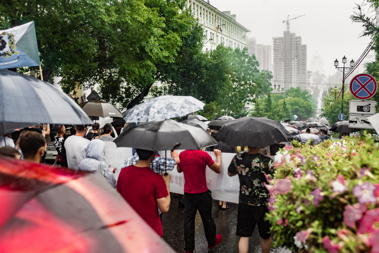 В это время колонна протестующих, численностью, по некоторым оценкам, около 30 тыс. человек, почти полностью скрылась под зонтами. От дождя они не особенно спасали, но на некоторых разместили лозунги: "Я/Мы Сергей Фургал", "20 лет доверия нет" и другие.