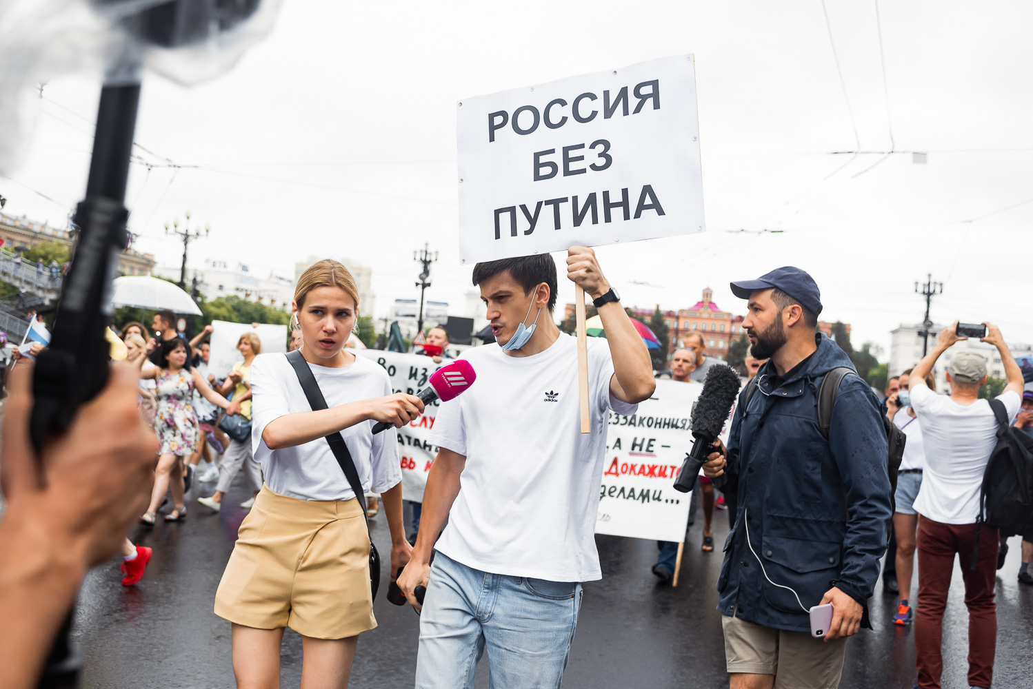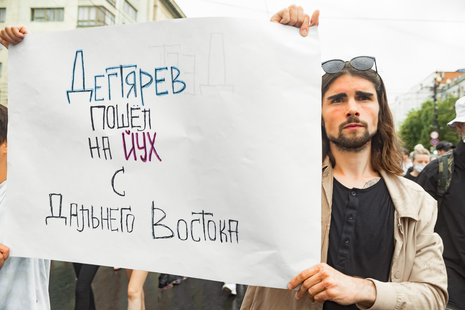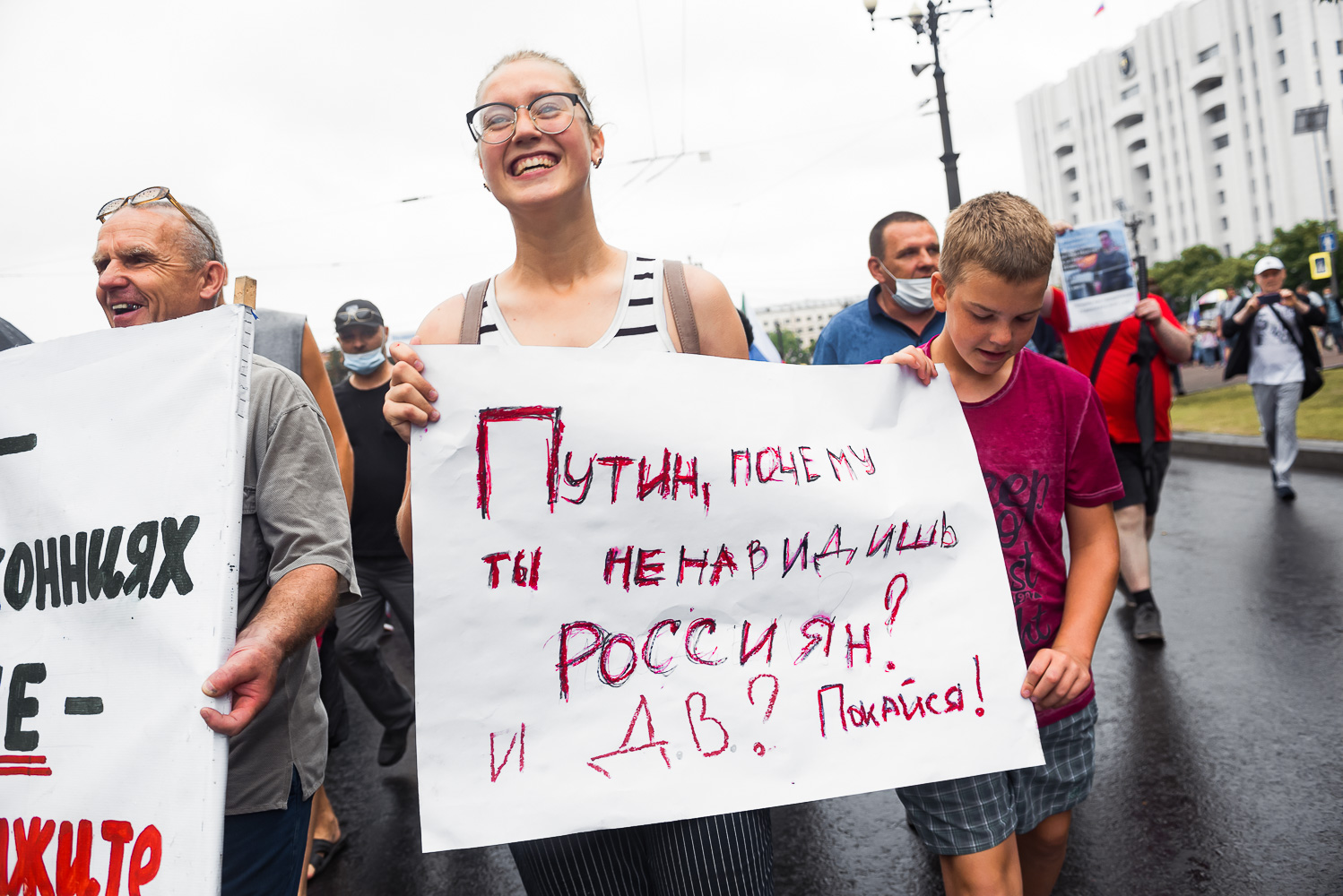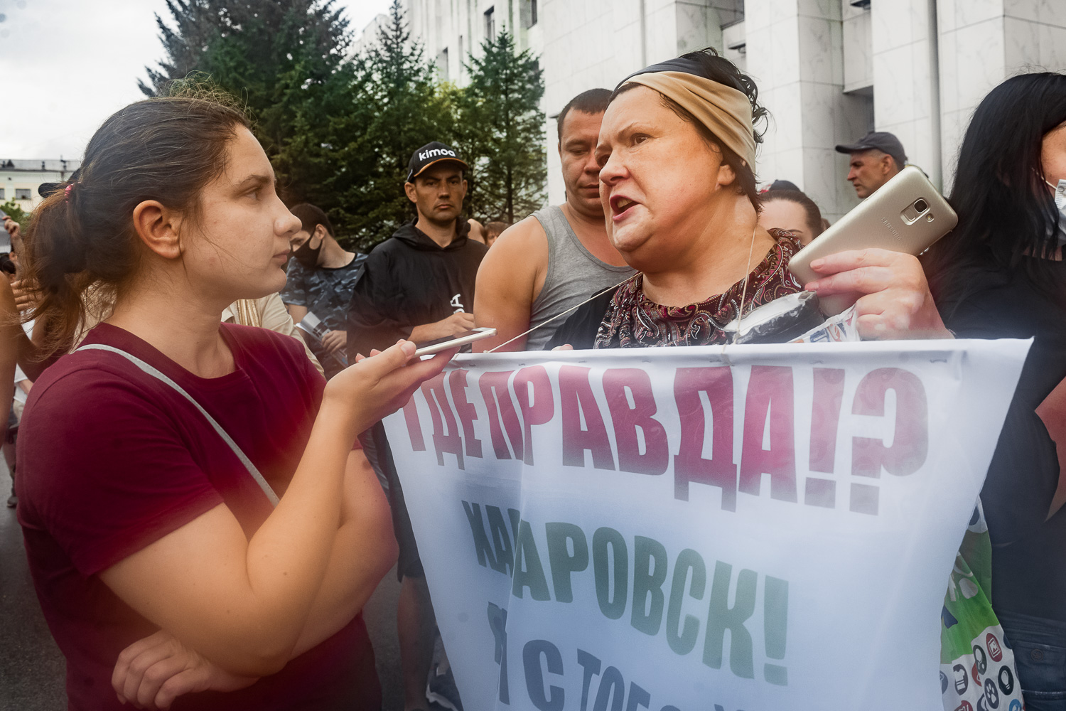 – У нас же по телевизору ничего не показывают. И я решила сама приехать – собрала на билет и вот. Теперь вот что я сниму, то и покажу и расскажу камчатцам. Здесь еще с нашего края есть люди, кстати. Но я сама по себе, – рассказывает Елена Владимировна. – У нас, конечно, и ютуб есть, и инстаграм. Но кто-то говорит, что все это фейки, кто-то – что тут сборища маргинальные какие-то. И хабаровчан поддерживаем – их свободный выбор. У нас же тоже выборы в этом году. Так уже сейчас что получилось – у кого был административный ресурс, тот и прошел фильтр по подписям. Но это же неправильно. Должна быть свобода выбора. А мы пока только и выбираем из чиновников да тех, у кого посты есть высокие. И мы с хабаровчанами хотим заявить, что есть люди, они устали нищать. Ну как так? Мы в богатейшей Камчатке своей рыбы даже не видим, коммуналка в ползарплаты!