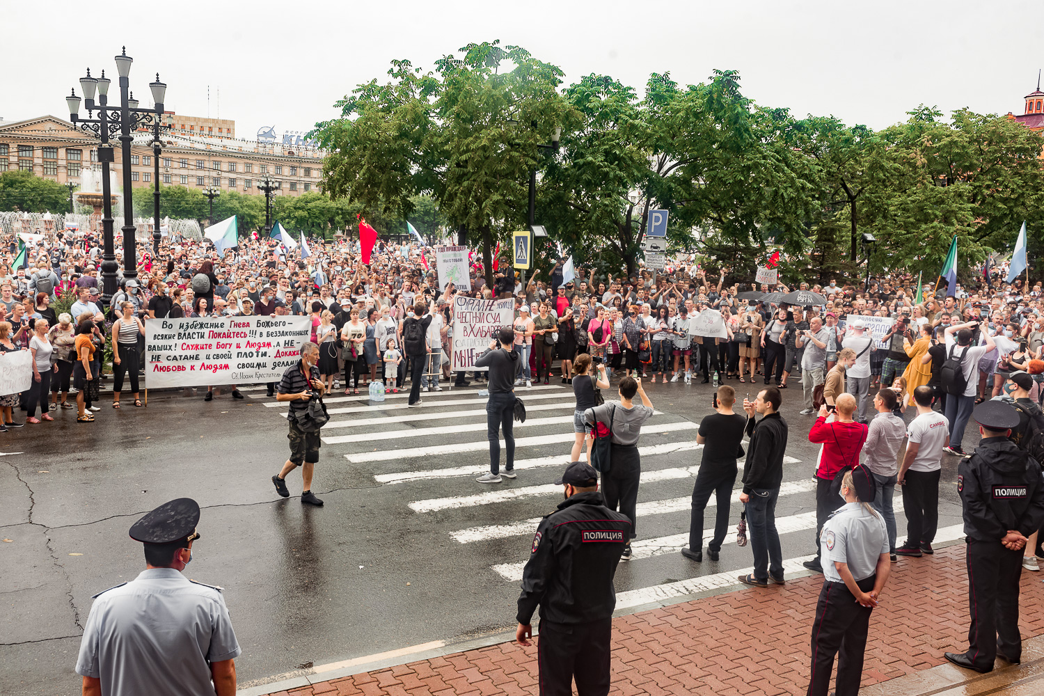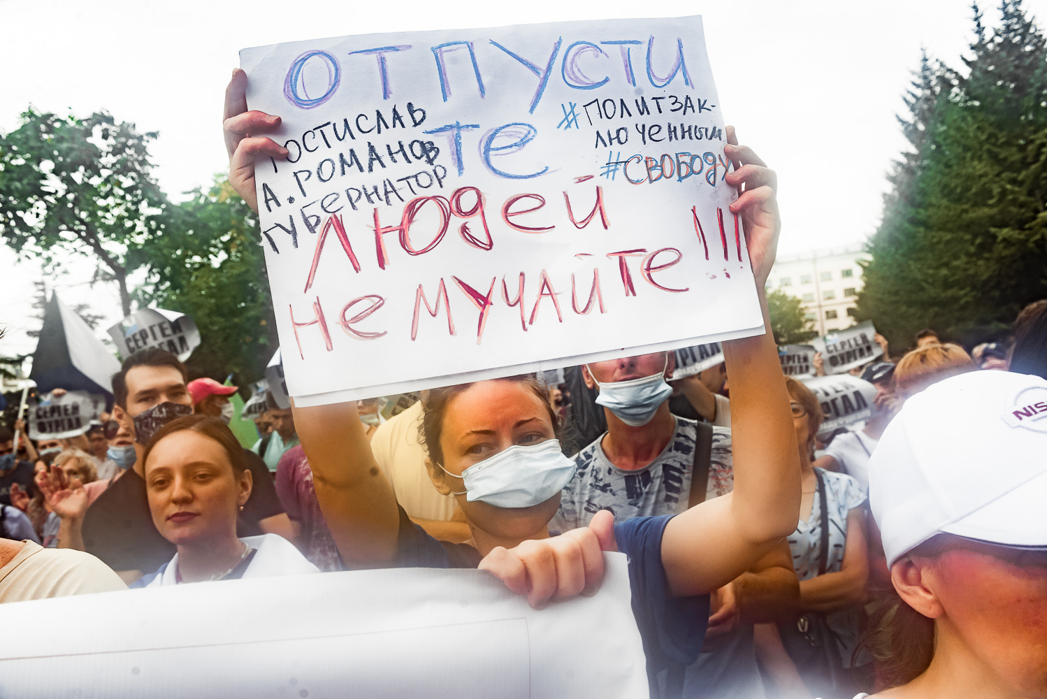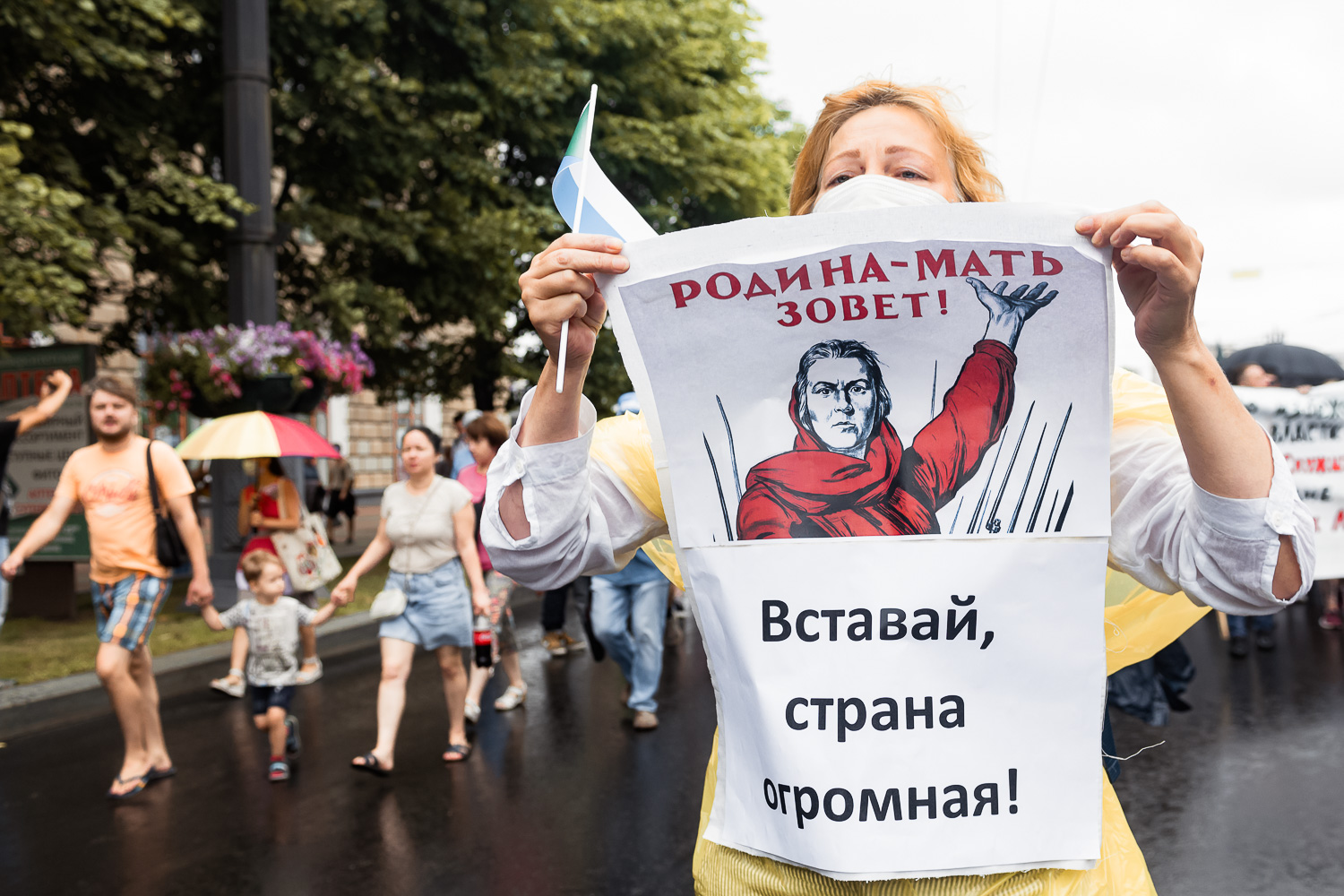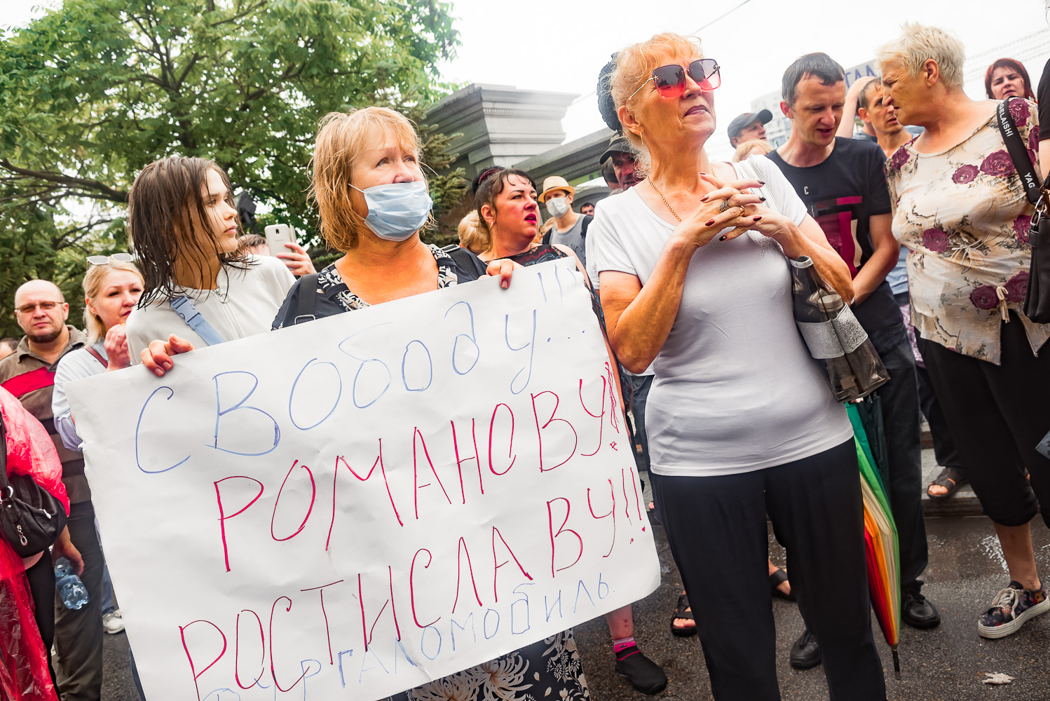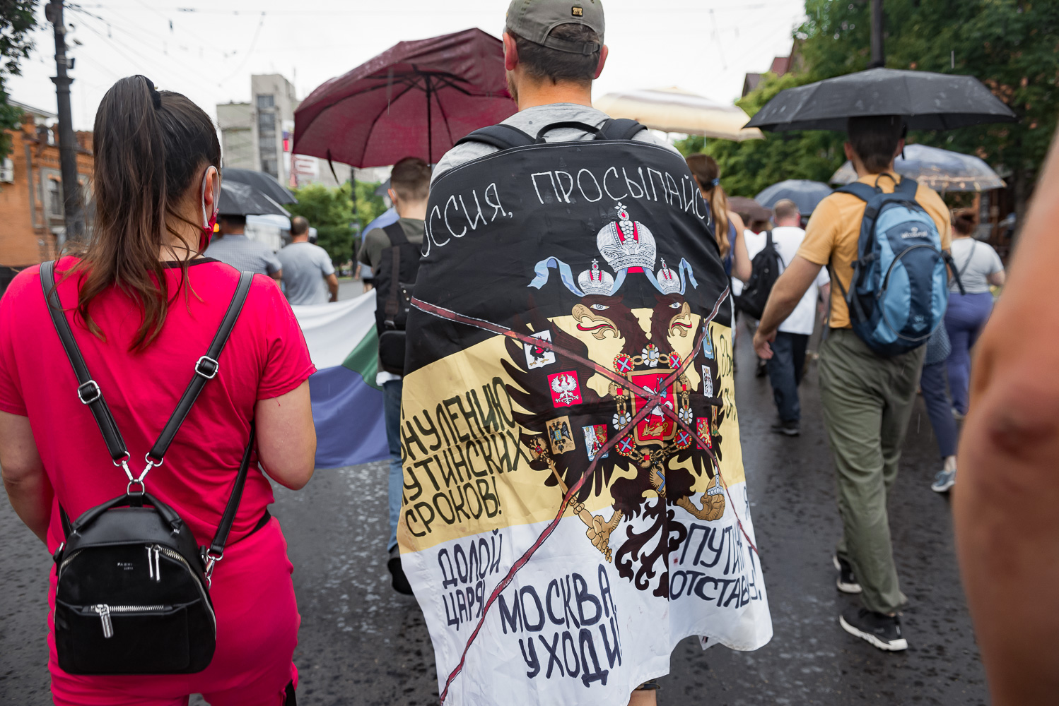 В Хабаровске прошла очередная массовая протестная акция – четвертую субботу подряд. На сей раз под сильным ливнем. Участников шествия и митинга не испугал ни дождь, ни прошедшие накануне задержания активистов Ростислава Буряка, Валентина Квашенникова и блогера Алексея Романова. Теперь протестующие к прежним лозунгам добавили новый – "Свободу политзаключенным". Побывала на акции и корреспондент Сибирь.Реалии.