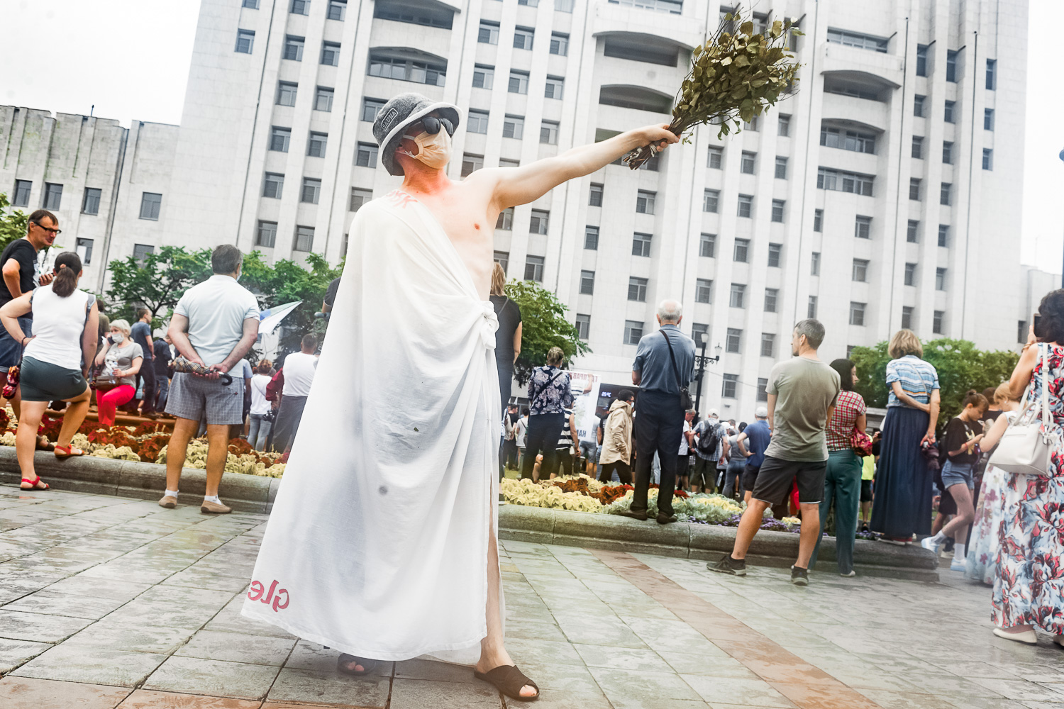 И все же о Михаиле Дегтяреве хабаровчане сегодня вспоминали не так уж часто. Гораздо актуальнее для города сейчас задержания активистов. Но один протестующий – известный среди горожан как Добрый хабаровчанин – на прошлый митинг приехал на велосипеде с вениками, намекая на известного любителя бани Дегтярева, а сегодня появился на площади с вениками и в простыне.