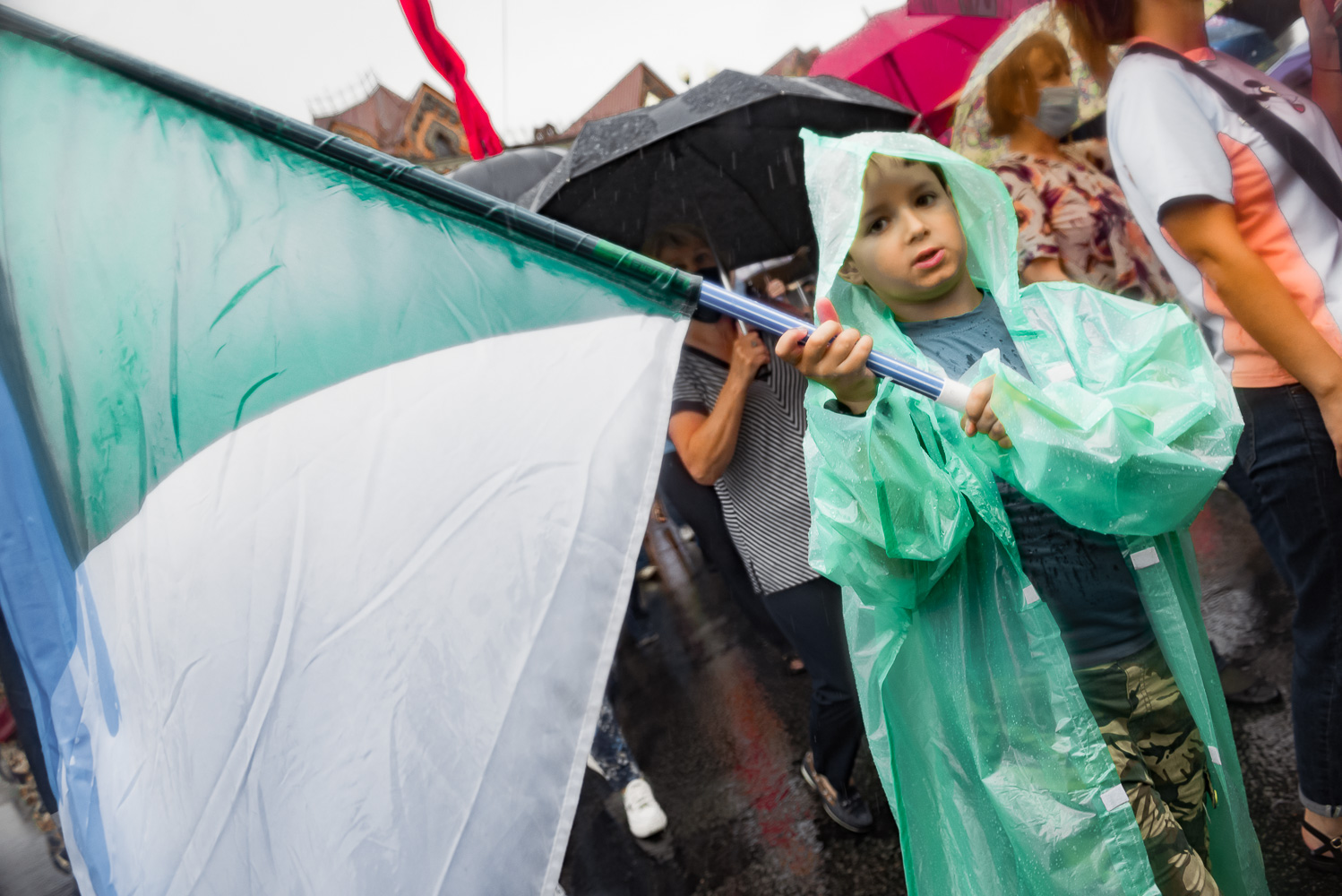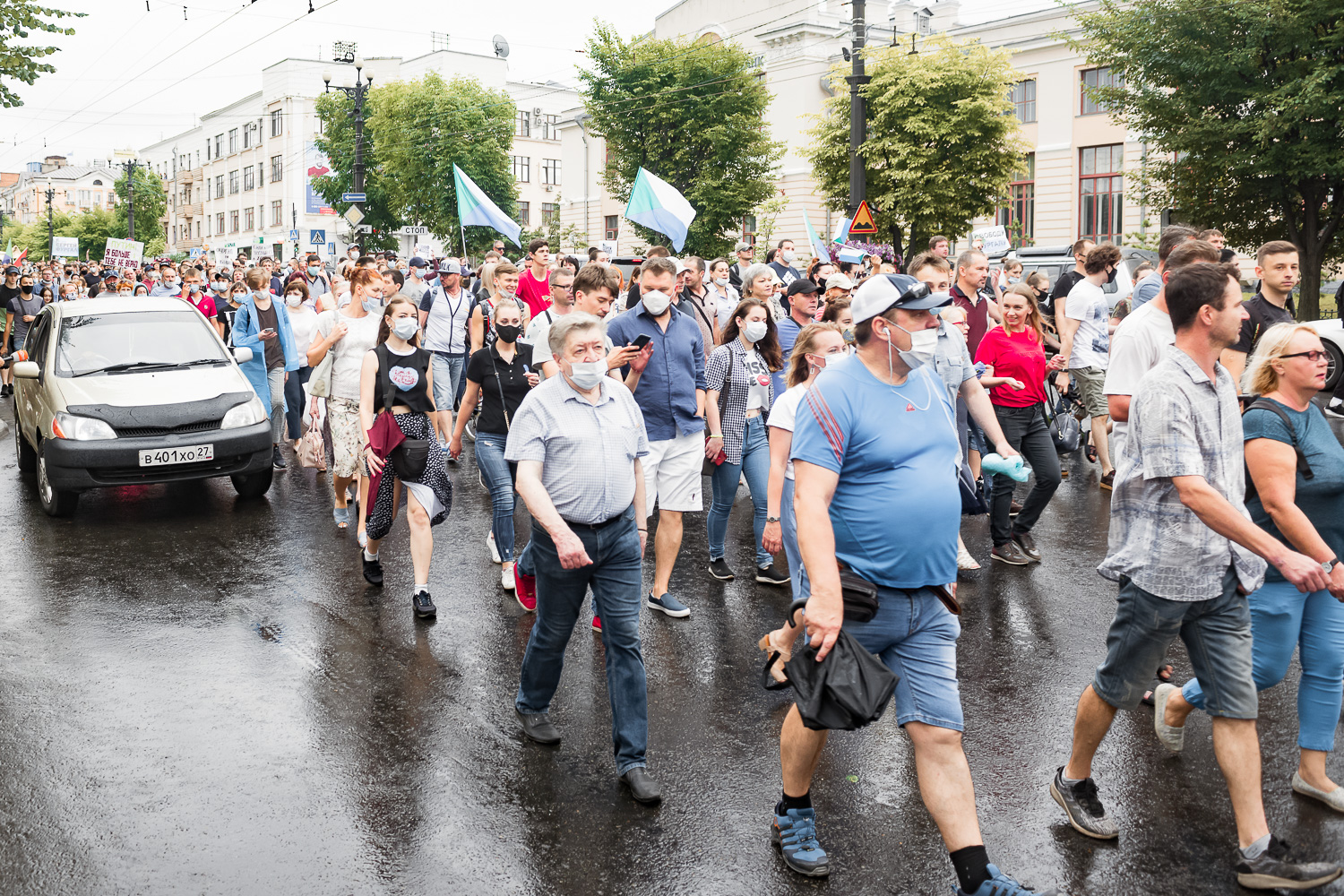 "Свободу политзаключенным!", "С нашей Родиной беда, просыпайтесь, города!", "Нам нужна поддержка всей страны!" – скандировали протестующие, направляясь традиционным маршем по центру города. Ставший практически неизменным за три недели маршрут – Карла Маркса, Муравьева-Амурского, Комсомольская, Ленина, Пушкина – сегодня пришлось пройти под проливным дождем. Часть протестующих решила идти по залитым дождем дорогам босиком.
