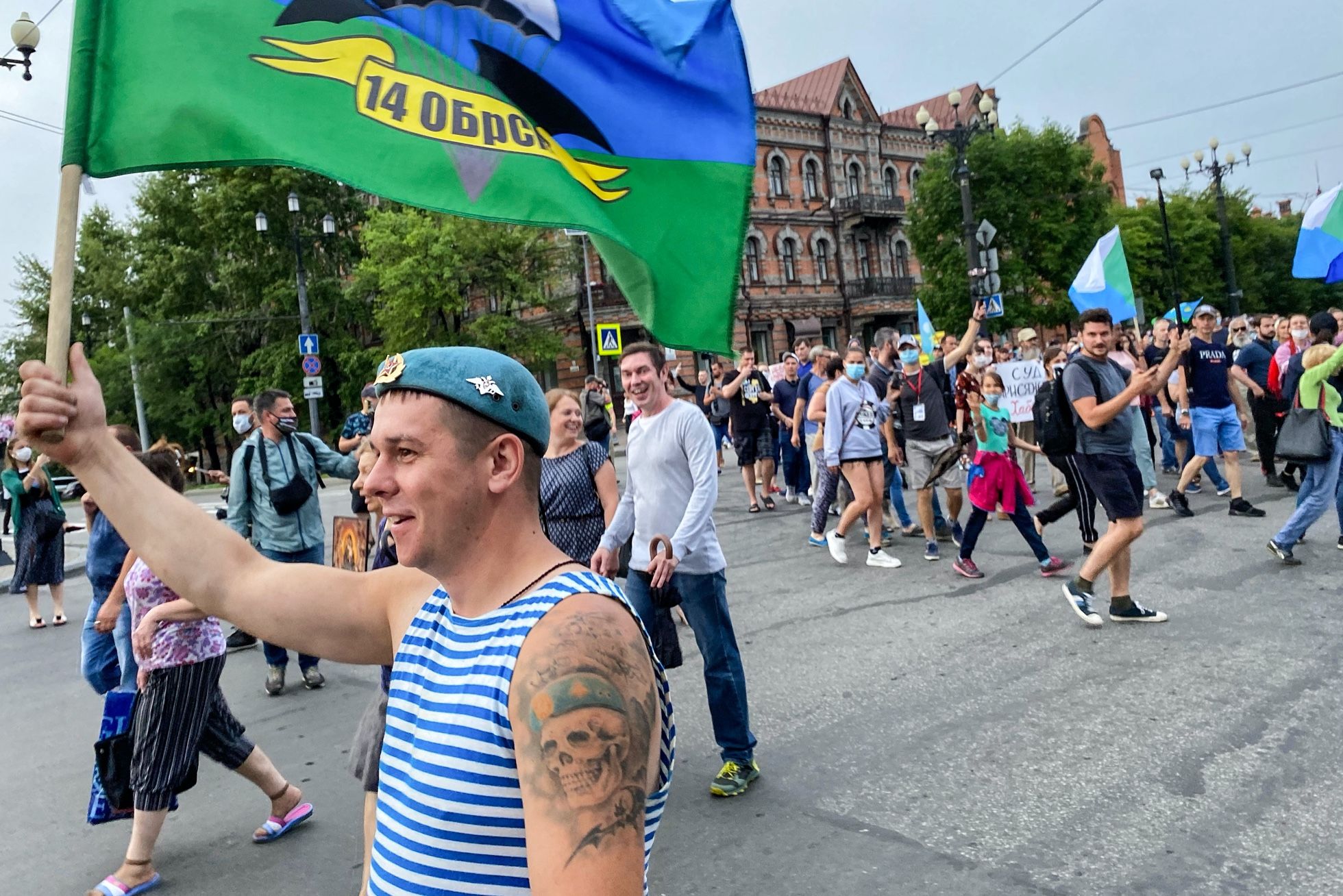 Евгений Фельдман для «Медузы» В Хабаровске прошла 23-я акция в поддержку бывшего губернатора Сергея Фургала, обвиненного в причастности к убийствам и покушениям на бизнесменов. 2 августа в России отмечают День ВДВ, и среди участников акции были бывшие десантники. Днем ранее акции солидарности с жителями Хабаровска прошли во многих крупных городах России.