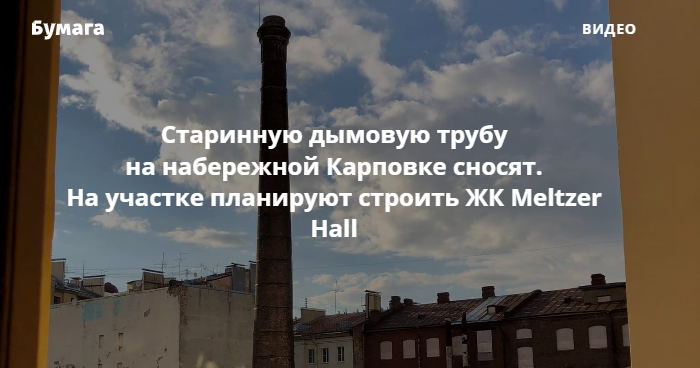 Утром 3 августа на набережной Карповки в Петроградском районе начали сносить историческую дымовую трубу, расположенную на территории бывшей мебельной фабрики Мельцера. Об этом «Бумаге» сообщили читатели.