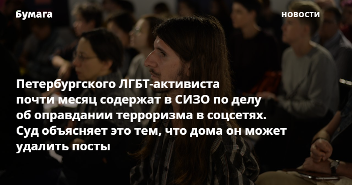 Октябрьский районный суд обосновал арест петербургского антифашиста, анархиста и ЛГБТ-активиста Александра Меркулова тем, что под домашним арестом он может удалить посты, из-за которых его обвиняют в оправдании терроризма (ч.2 ст.205.2 УК). Об этом говорится в материалах уголовного дела, копия есть в распоряжении «Бумаги».