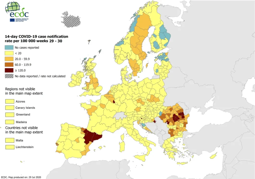 Судя по сводной карте, которую составил Европейский центр по профилактике и контролю заболеваний (ECDC), после апрельского пика пандемия в Европе отступала в мае, держалась на низком плато весь июнь и почти до конца июля. Потом кривая угрожающе поползла вверх. Параллельно менялась жизнь.
