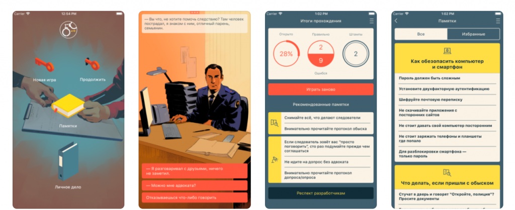 В 2017-2019 годах команда нашего проекта, еще работая в правозащитном объединении «Команда 29», выпустила игру «Гэбня», построенную на таких же принципах. Это была серия коротких историй о молодом человеке, которому приходится столкнуться с вроде бы непобедимой государственной машиной. Задача игрока не только вытащить героя из тюрьмы или вовсе не дать ему туда попасть, но и узнать самому, как вести себя при обыске и на допросе.