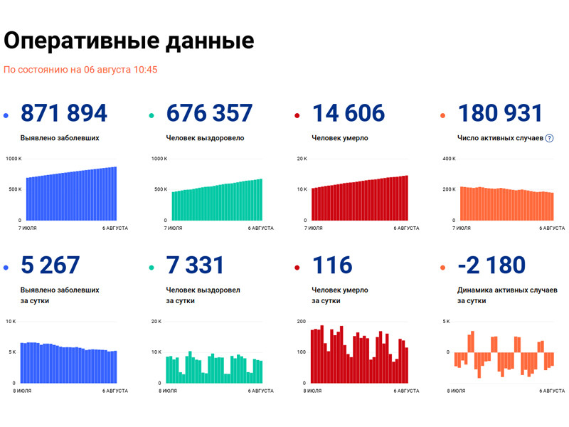 Из больниц за последние сутки выписано 7331 человек. Общее число выздоровевших пациентов увеличилось до 676 357 человек.