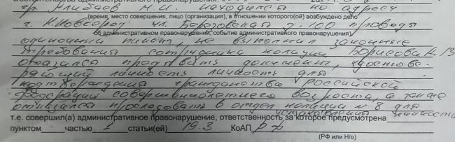 «Отказался предъявить документ, удостоверяющий личность, для подтверждения гражданства Российской Федерации, совершеннолетнего возраста, а также отказался проследовать в отдел полиции № 8 для установления личности», — написали полицейские в протоколе.