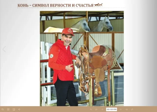 это на самом деле тоже далеко не первое обращение Бердымухамедова к теме одной из национальных гордостей страны — ахалтекинских коней. Были еще «Стремительная поступь скакуна», «Ахалтекинский скакун — наша гордость и слава», «Полет небесных скакунов» (последняя книга не принадлежит перу Бердымухамедова, но он как предводитель коневодства в стране упоминается в ней чаще, чем, собственно, сами лошади). Общий мотив этих книг можно описать тремя тезисами: